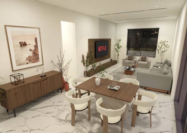 Das Innere dieser Häuser ist mit einem Fokus auf Komfort und Funktionalität gestaltet. Die Grundrissoptionen umfassen Wohnungen mit 2 und 3 Schlafzimmern, mit 2 oder 3 Bädern, die sich an unterschiedliche familiäre Bedürfnisse anpassen. Einbauschränke bieten effizienten Stauraum, während die Vorinstallation einer Klimaanlage das ganze Jahr über für ein angenehmes Raumklima sorgt. Die Verwendung von Feinsteinzeugböden verleiht einen modernen und eleganten Touch und ist zudem eine praktische und langlebige Option. Die Einbeziehung einer Garage in jedem Haus bietet den Bewohnern zusätzlichen Komfort und Sicherheit.