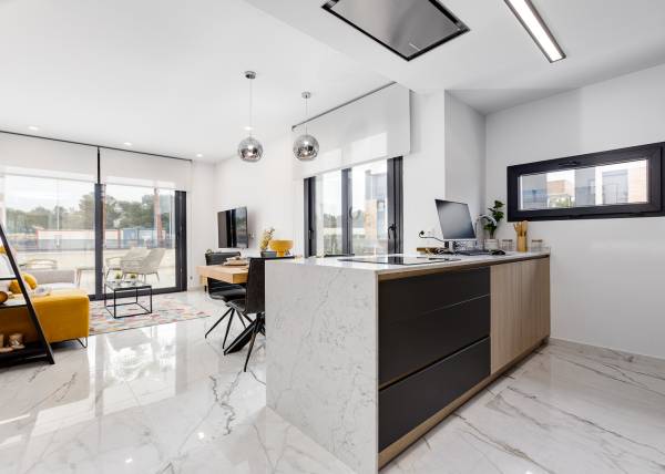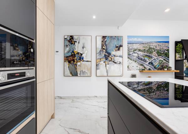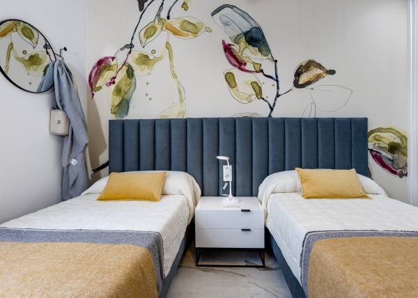Die Wohnungen sind mit modernen Merkmalen ausgestattet, die ein hohes Maß an Komfort gewährleisten. Die Feinsteinzeugböden verleihen Eleganz und sind pflegeleicht. Elektrische Rollläden und die enthaltenen Elektrogeräte erleichtern den Alltag, während Einbauschränke effizienten Stauraum bieten. Die Vorinstallation der Klimaanlage sorgt dafür, dass jedes Zuhause leicht an die Temperaturvorlieben der Bewohner angepasst werden kann. Die Raumaufteilung umfasst zwei Schlafzimmer und zwei Badezimmer und bietet ausreichend Platz für Familien oder Paare. Die Terrassen und Solariums, die in einigen Typologien verfügbar sind, ermöglichen es, das mediterrane Klima und den freien Blick zu genießen.