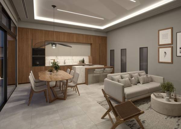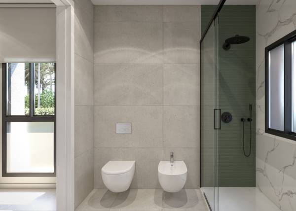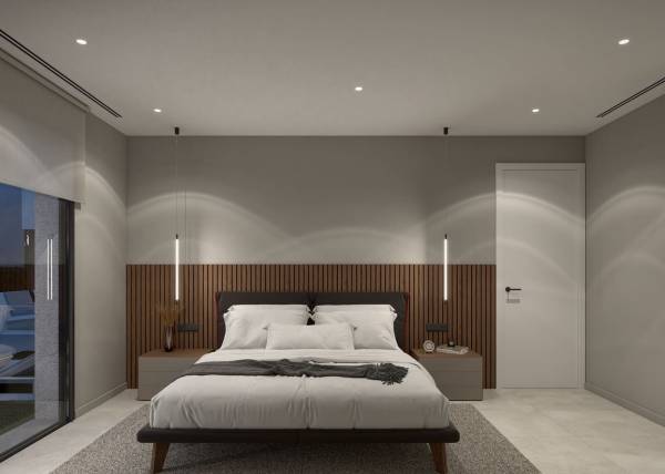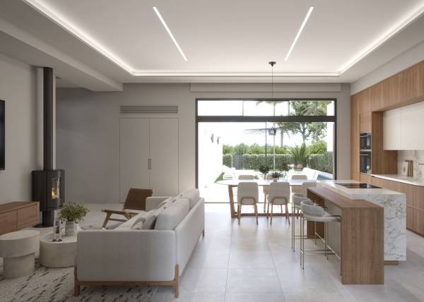 Das Innere dieser Villen wurde entworfen, um maximalen Komfort und Funktionalität zu bieten. Mit drei Schlafzimmern und zwei Bädern ist jeder Raum optimiert, um den Bedürfnissen einer modernen Familie gerecht zu werden. Die Böden aus Feinsteinzeug verleihen einen Hauch von Eleganz und sind pflegeleicht. Die Villen sind mit hochwertigen Geräten ausgestattet, die sicherstellen, dass die Küche sowohl praktisch als auch stilvoll ist. Elektrische Rollläden und Einbauschränke sind Standardmerkmale, die den Alltag komfortabler und effizienter gestalten. Jedes Detail wurde sorgfältig durchdacht, um ein einladendes und zeitgemäßes Zuhause zu schaffen.