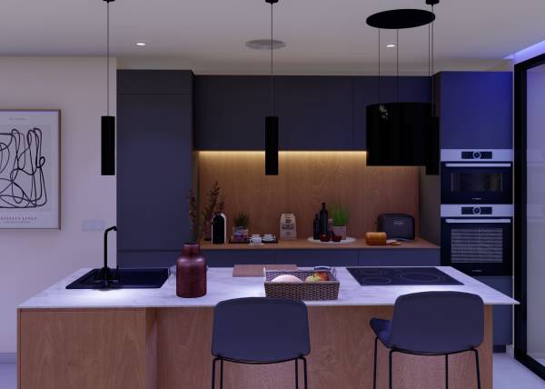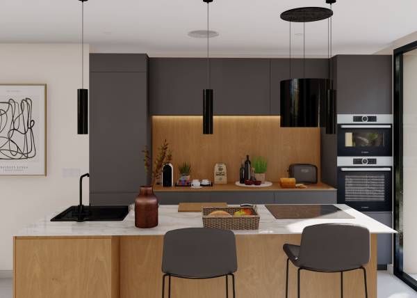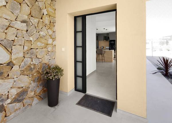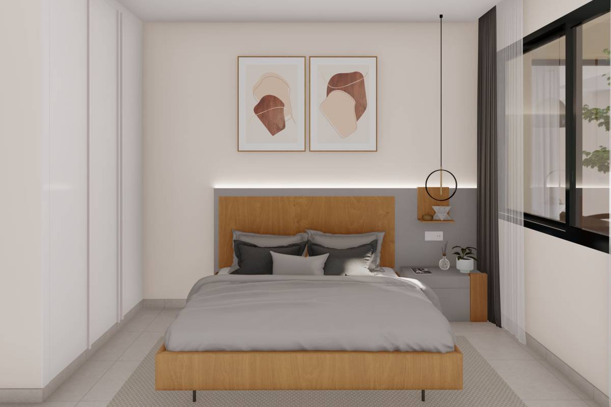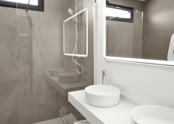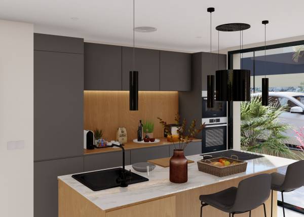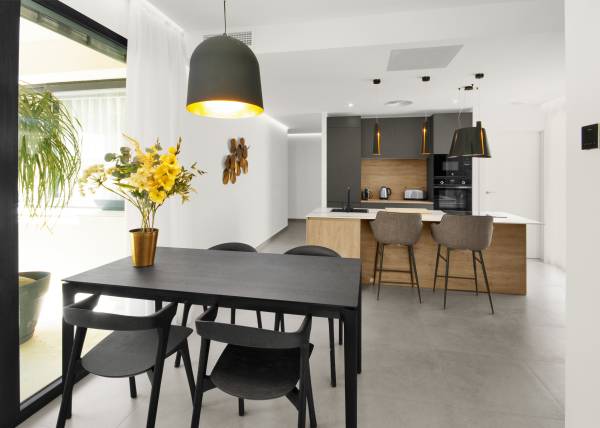 Das Innere der Wohnhäuser spiegelt ein modernes und funktionales Design wider. Die Böden aus Feinsteinzeug verleihen einen Hauch von Raffinesse und sind pflegeleicht, ideal für den Alltag. Die Klimatisierung ist mit einer Klimaanlage gewährleistet, die in allen Jahreszeiten Komfort bietet. Einbauschränke bieten praktische und elegante Stauraumlösungen und optimieren den Platz in jedem Raum. Die Aufteilung umfasst eine Garage, die Sicherheit und Komfort für das Parken von Fahrzeugen bietet. Diese Innenmerkmale sind darauf ausgelegt, ein gemütliches und funktionales Zuhause zu bieten.