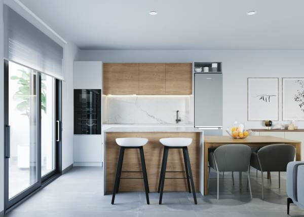 Jede Villa verfügt über 2 Schlafzimmer und 2,5 Bäder und besticht durch ihre Liebe zum Detail. Die Küchen sind komplett ausgestattet mit modernen Geräten und bereit, das Herzstück des Hauses zu sein. Die Bäder sind mit hochwertigen Waschtischmöbeln und integriertem Licht ausgestattet, was eine Kombination aus Praktikabilität und Design garantiert. Die Schlafzimmer beinhalten gefütterte Schränke mit Schubladeneinheiten, was den Stauraum optimiert. Zudem ist jede Immobilie für die Installation einer Klimaanlage über Leitungen vorbereitet, was zu jeder Zeit ein angenehmes Ambiente gewährleistet. Diese Innenräume, kombiniert mit hochwertigen Oberflächen, schaffen ein gemütliches und elegantes Zuhause.