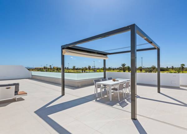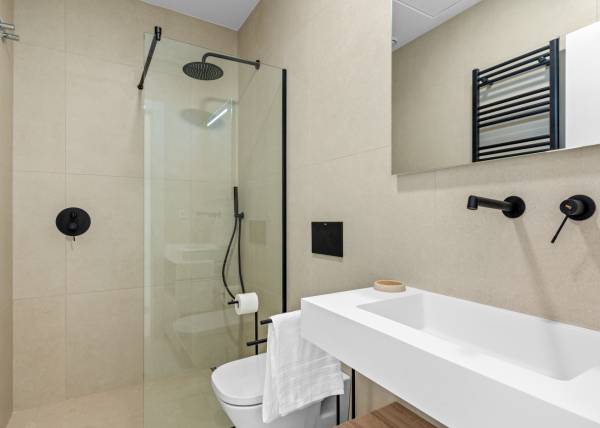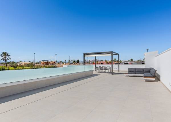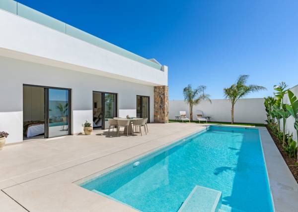 Das Innere des Hauses ist darauf ausgelegt, maximalen Komfort zu bieten. Mit drei Schlafzimmern und zwei Bädern ist der Raum geeignet, um eine Familie oder Gäste unterzubringen. Die Einbauschränke in den Schlafzimmern optimieren den Stauraum und sorgen für Ordnung und Ästhetik. Die Küche ist mit modernen Geräten ausgestattet, die die täglichen Aufgaben erleichtern. Der Boden aus Feinsteinzeug verleiht einen Hauch von Eleganz und ist pflegeleicht. Die Klimaanlage sorgt das ganze Jahr über für eine angenehme Temperatur, während die elektrischen Rollläden Komfort und Sicherheit bieten.