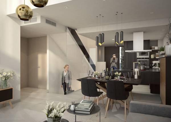 Inside, the townhouses are designed to offer maximum comfort and functionality. Each property has three bedrooms and two bathrooms, providing a spacious and well-distributed space for the whole family. The built-in wardrobes in the bedrooms offer practical and elegant storage solutions. The layout also includes a private garage, ensuring convenience and security for the residents. The interior design focuses on quality and efficiency, creating a welcoming and modern atmosphere.