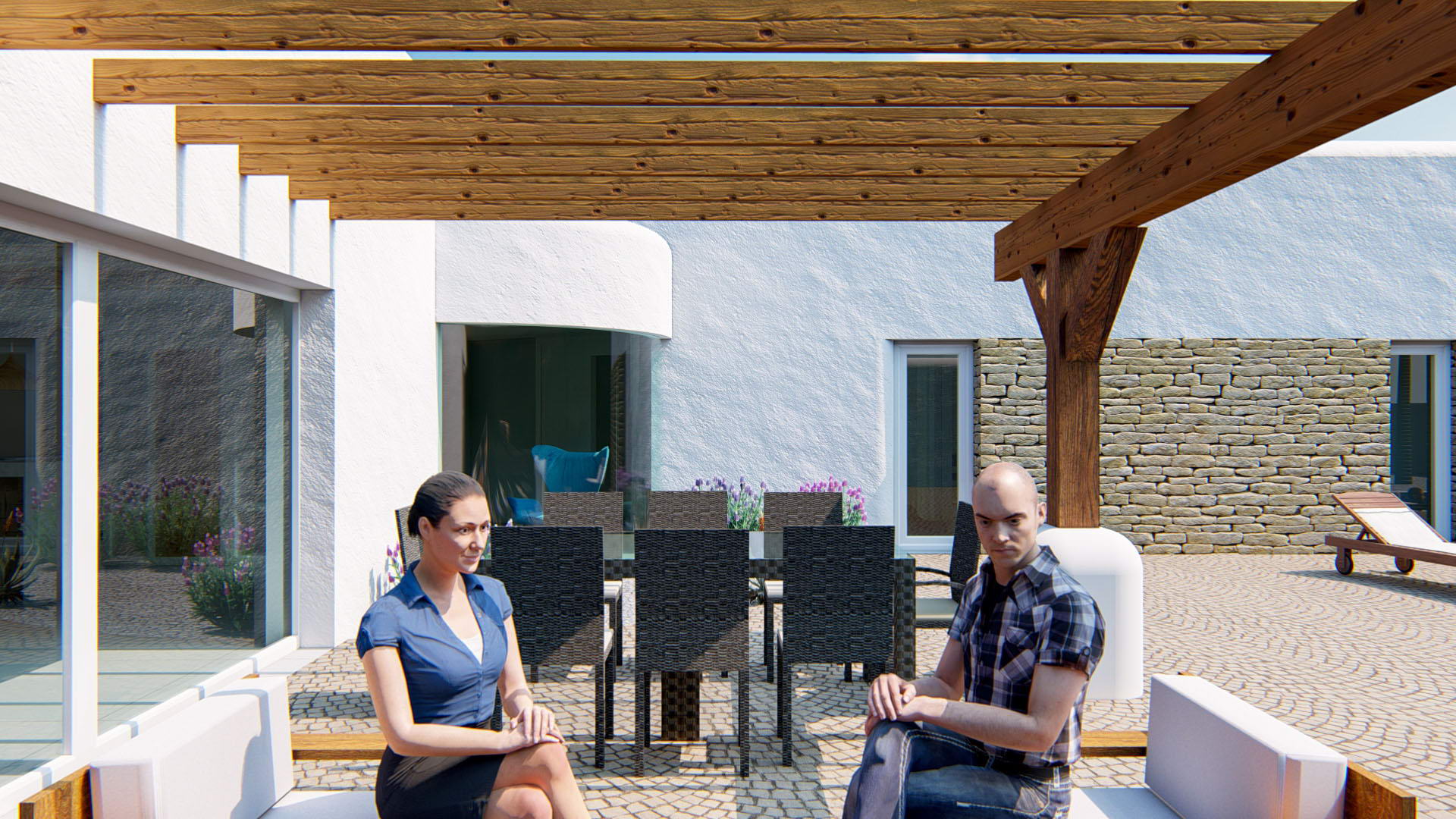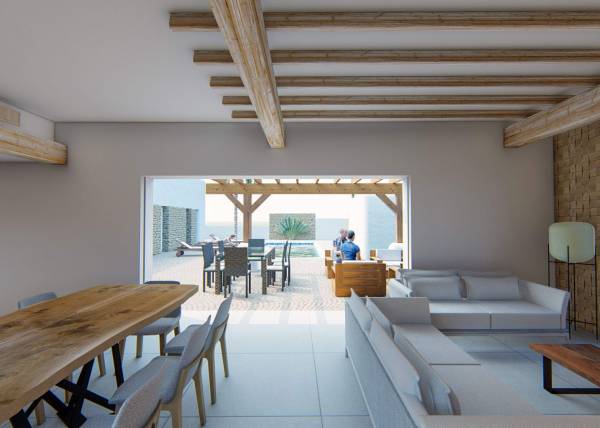 The exterior of this detached villa in Alfaz del Pi is designed to maximize enjoyment of the Mediterranean climate. It features a beautiful garden, ideal for relaxing or enjoying outdoor activities. The terrace is a perfect space for al fresco dining or simply enjoying the views and natural surroundings. Additionally, the property includes a private pool, offering a personal oasis for cooling off during warm summer days. The pergola adds a touch of elegance and provides shade, creating a welcoming outdoor atmosphere.