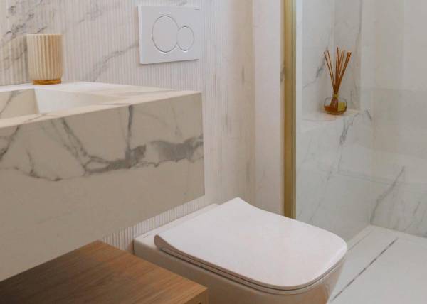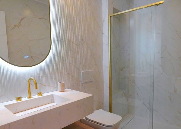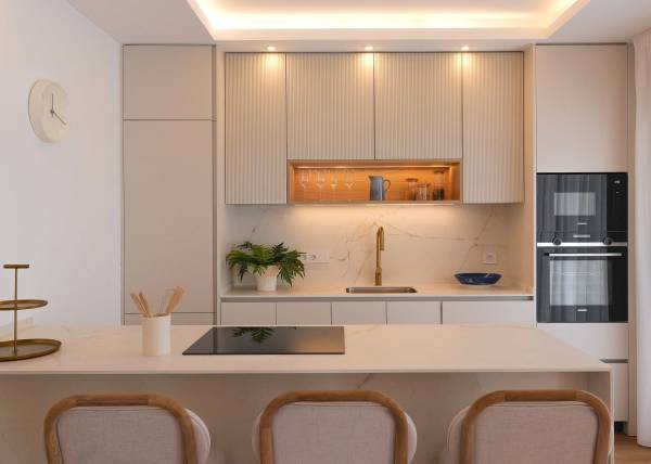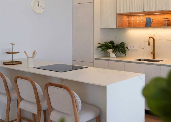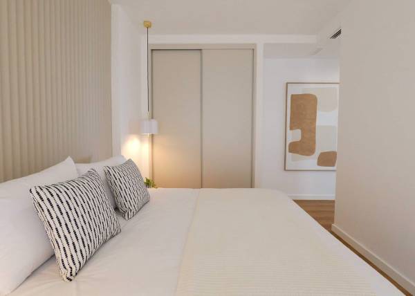 The interior design of the homes in this residential complex in La Manga is crafted to offer maximum comfort and functionality. The available apartments and penthouses feature layouts that include options of 1, 2, and 3 bedrooms, as well as 1, 2, and 3 bathrooms, catering to the needs of different family types. Porcelain tile floors add a modern and elegant touch, while integrated appliances ensure a comfortable and efficient living experience. Built-in wardrobes are designed to optimize space, providing practical and aesthetic storage solutions. Every detail has been carefully considered to create a welcoming and sophisticated environment.