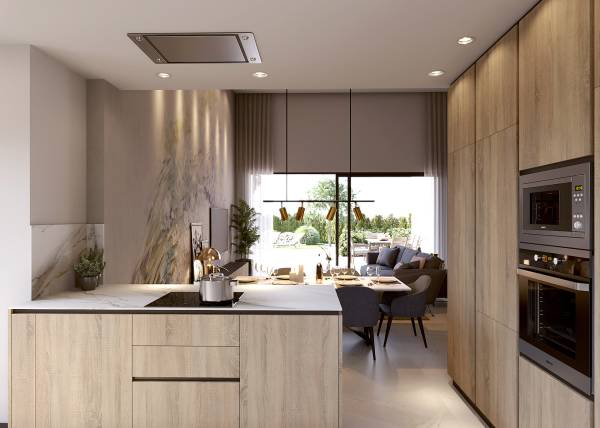 The interior of the villas is designed to offer maximum comfort and style. Each villa features three bedrooms and four bathrooms, ensuring space and privacy for all family members. The villas are equipped with air conditioning, ensuring a pleasant atmosphere throughout the year. Electric shutters and built-in wardrobes are standard features that provide convenience and functionality. Additionally, each villa includes a garage, providing a secure parking space. The solarium is an additional space that allows you to enjoy the views and the sun in a private setting.