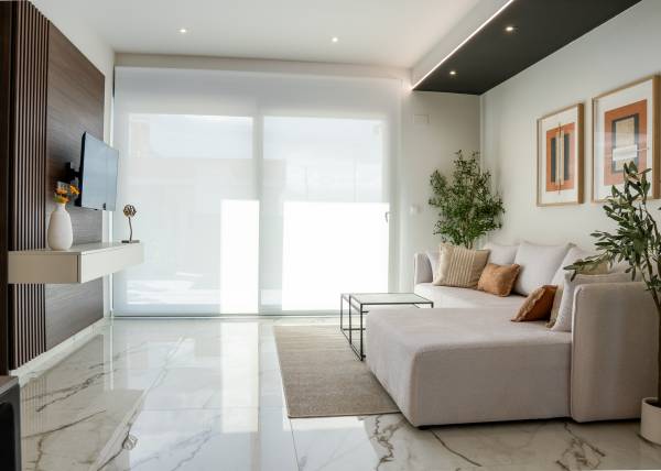 Inside, the homes are equipped with air conditioning, ensuring a pleasant environment year-round. Built-in wardrobes offer efficient storage space, maintaining order and organization in the home. The layout includes three bedrooms and two bathrooms, providing a comfortable and functional space for families or couples seeking a spacious home. Attention to detail in the interior design ensures a modern and welcoming atmosphere, ideal for daily living.