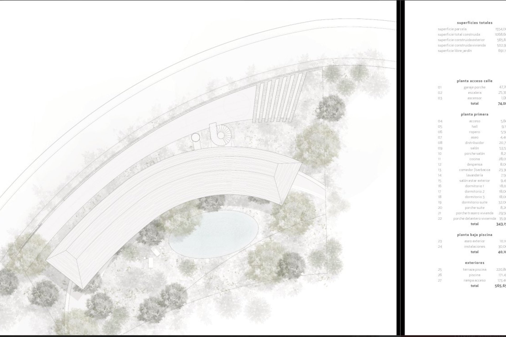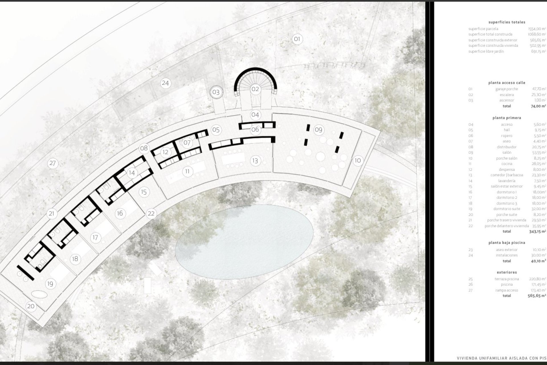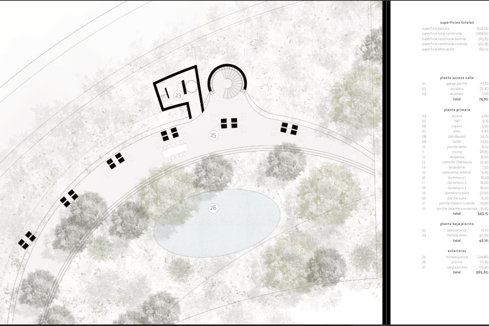 The villa features a spacious private garden, perfect for enjoying the Mediterranean climate. The terrace is an ideal space for outdoor relaxation, hosting dinners, or simply enjoying the sea views. Additionally, the property includes a private pool, offering an oasis of tranquility and privacy. The exterior design is intended to harmoniously integrate with the surroundings, providing a space for outdoor rest and enjoyment.