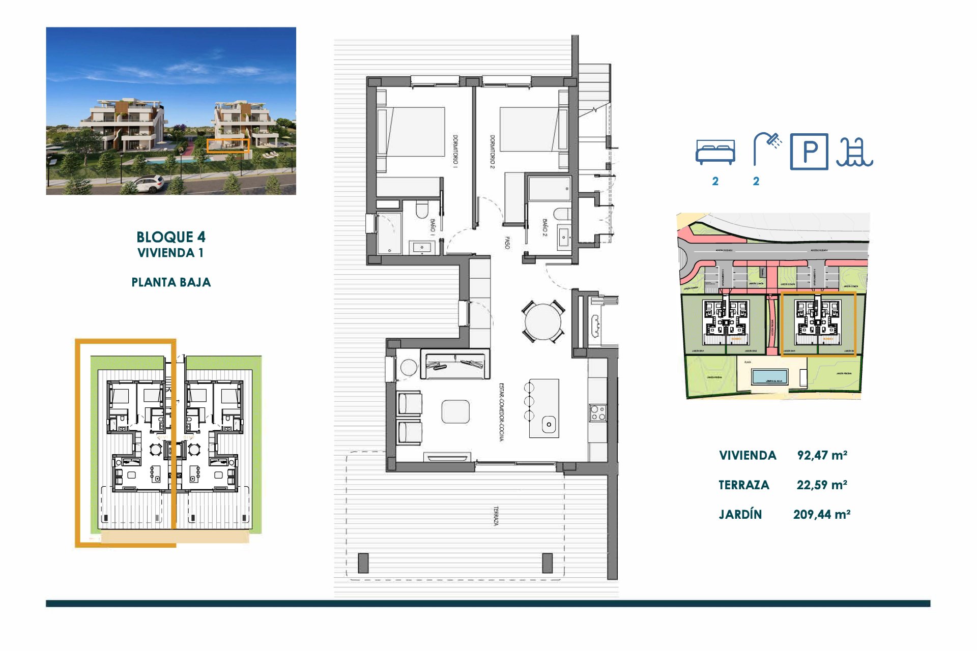 The exteriors of these properties are designed to maximize enjoyment of the Mediterranean climate. Each home features a private terrace, perfect for relaxing outdoors and enjoying views of the natural surroundings. Additionally, ground floors have private gardens, offering additional space for outdoor activities. Penthouses, on the other hand, include a solarium, ideal for sunbathing in total privacy. The community also boasts extensive landscaped areas, providing a green and serene environment for all residents. Proximity to the golf course, just 1 km away, allows residents to enjoy this sport in a first-class setting.