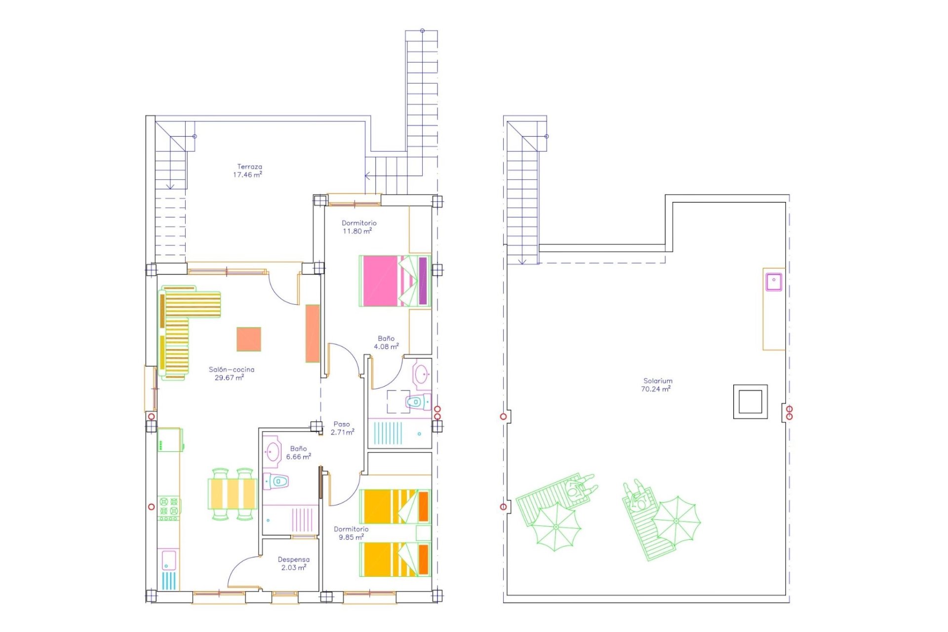 The exteriors of these bungalows in San Javier are designed to enjoy the Mediterranean climate year-round. Each property features a private garden, perfect for creating a personal oasis of tranquility or enjoying outdoor moments with friends and family. Additionally, the terraces offer extra space to relax, sunbathe, or enjoy an al fresco dinner. The presence of a solarium in each bungalow provides an ideal place to enjoy the views and sunny weather, becoming a versatile space for various outdoor activities.