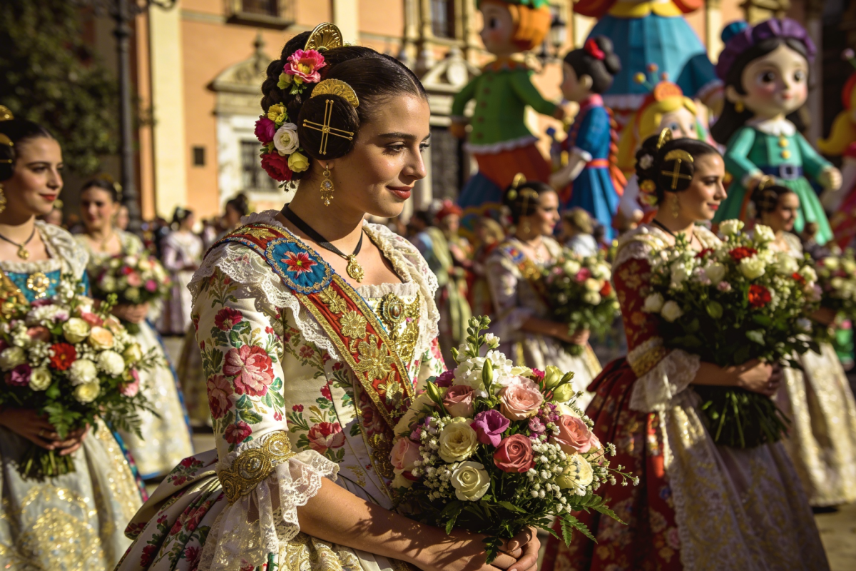 Tijdens de Ofrenda de Flores (17 en 18 maart 2026) brengen duizenden deelnemers bloemen naar de Virgen de los Desamparados, de beschermheilige van Valencia. De bloemen vormen samen een gigantisch mozaïek op de Plaza de la Virgen.