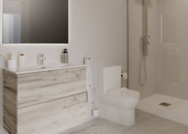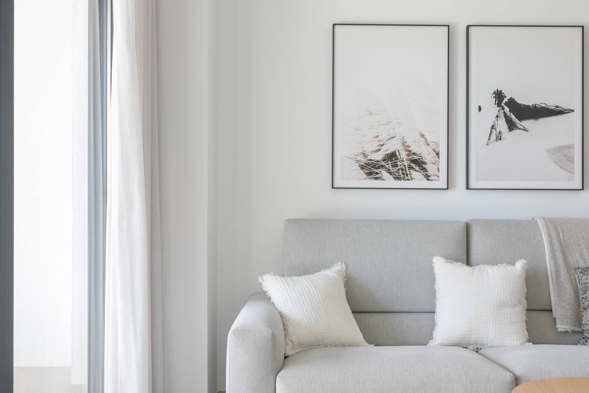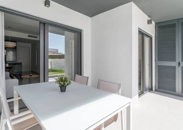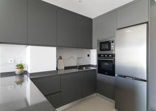 Het interieur van deze woningen is zorgvuldig ontworpen om een moderne en functionele sfeer te bieden. Porseleinen vloeren geven een vleugje elegantie en duurzaamheid, terwijl elektrische rolluiken comfort en energie-efficiëntie toevoegen. De keukens zijn uitgerust met hoogwaardige apparatuur, wat het dagelijks leven vergemakkelijkt. Ingebouwde kasten optimaliseren de opslagruimte, waardoor orde en esthetiek behouden blijven. De indeling omvat opties van 2 of 3 slaapkamers en 2 of 3 badkamers, aangepast aan verschillende levensstijlen.