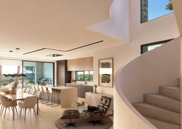 Binnenin valt de villa op door zijn functionele indeling en hoogwaardige afwerking. Met vier slaapkamers en vier badkamers is elke ruimte ontworpen om comfort en privacy te bieden. De toevoeging van airconditioning en vloerverwarming zorgt voor een aangename temperatuur het hele jaar door. Ingebouwde kasten in de slaapkamers bieden efficiënte opslag, wat bijdraagt aan een opgeruimde en elegante sfeer.