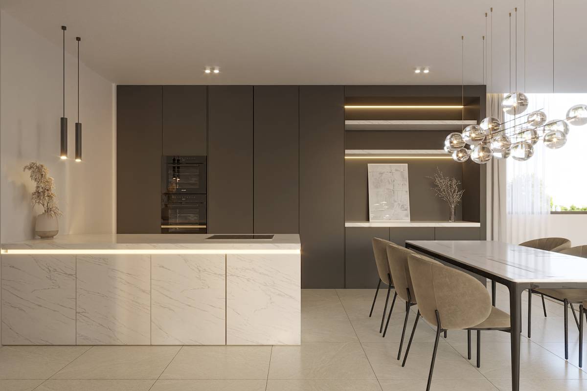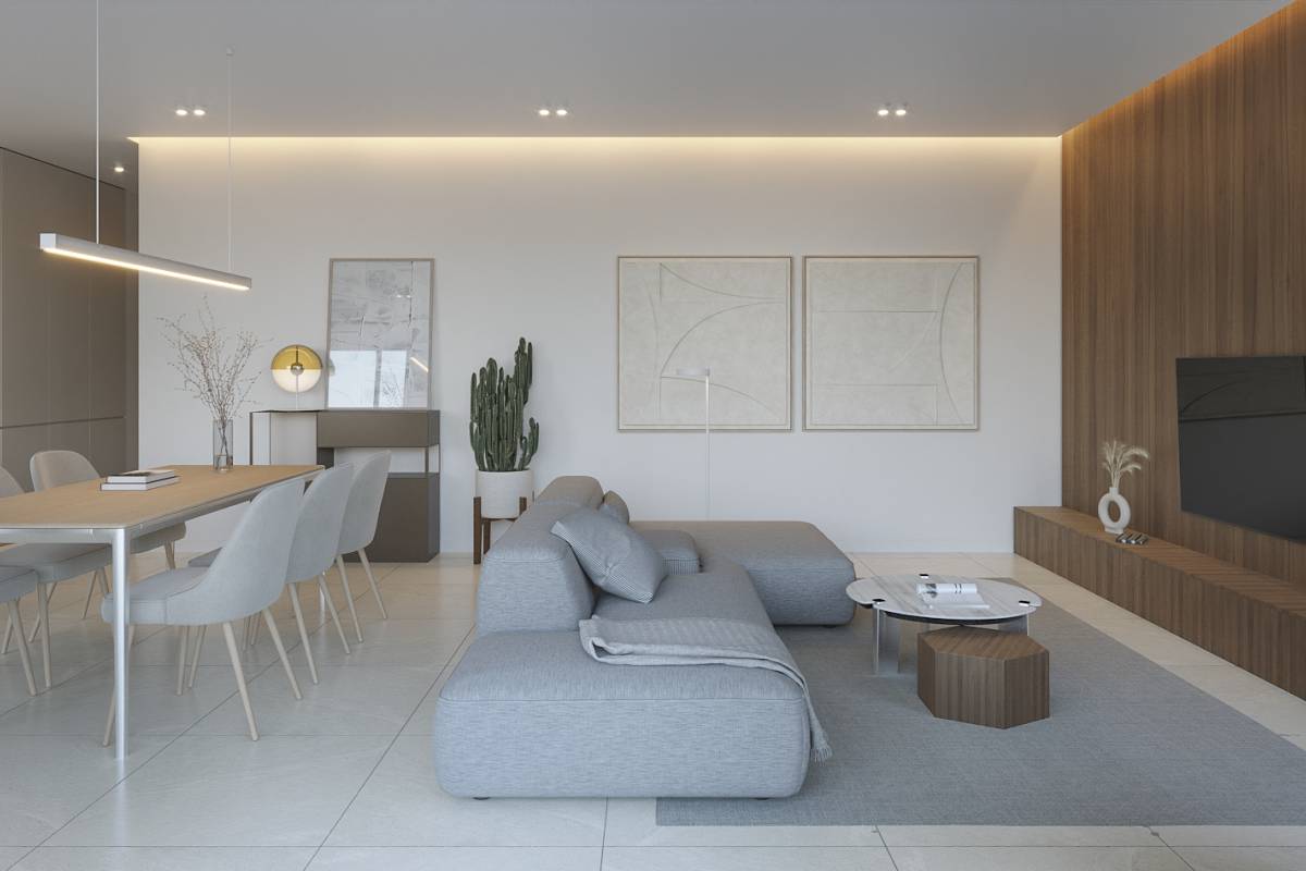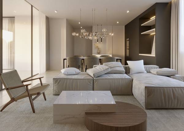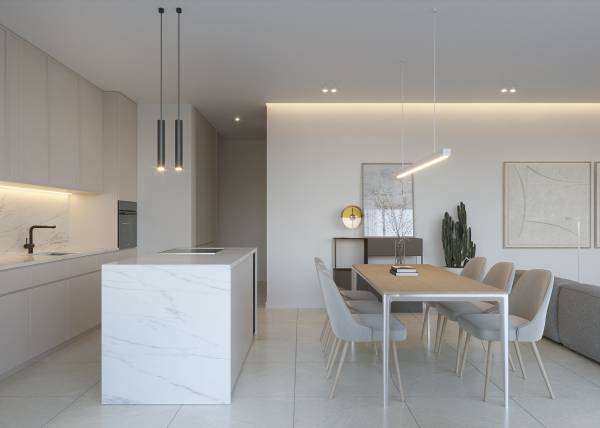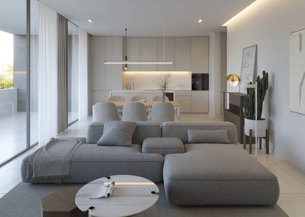 Het interieur van deze woningen is zorgvuldig ontworpen om comfort en moderniteit te bieden. De appartementen, begane grond en penthouses zijn beschikbaar in configuraties van 2 en 3 slaapkamers, allemaal met 2 badkamers. De keukens zijn volledig uitgerust met moderne apparatuur en de woningen zijn gemeubileerd, klaar om in te trekken. Het airconditioningsysteem omvat airconditioning en vloerverwarming, wat comfort het hele jaar door garandeert. De keramische en porseleinen vloeren geven een vleugje verfijning en zijn gemakkelijk te onderhouden. Elektrische rolluiken en de video-intercom voegen een extra niveau van comfort en veiligheid toe.