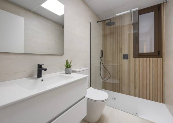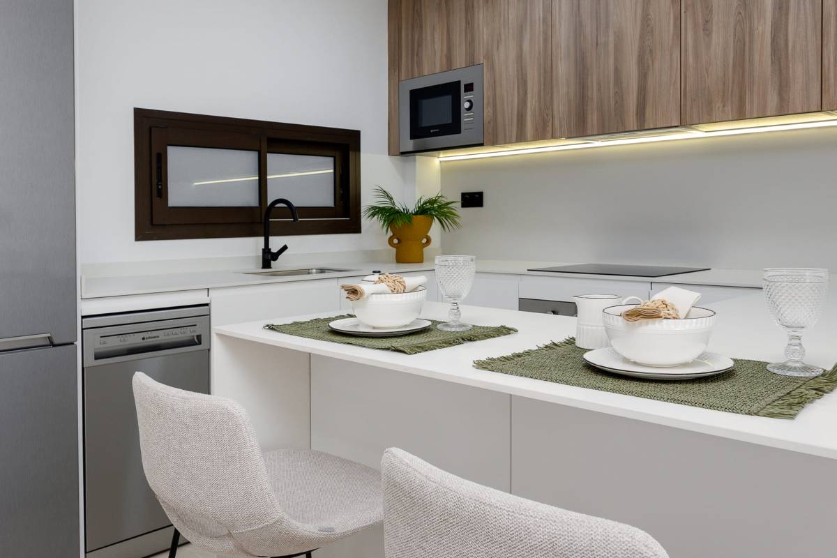 Het interieur van de woningen is zorgvuldig ontworpen om comfort en moderniteit te bieden. De porseleinen tegelvloeren geven een elegante uitstraling en zijn gemakkelijk te onderhouden. De woningen zijn uitgerust met moderne apparaten, waardoor de keuken zowel functioneel als stijlvol is. Elektrische rolluiken en de video-intercom voegen een extra niveau van comfort en veiligheid toe. De ingebouwde kasten in de slaapkamers bieden veel opbergruimte, waardoor de ruimtes netjes en opgeruimd blijven. De indelingsopties omvatten woningen met 2 en 3 slaapkamers, allemaal met 2 badkamers, wat voldoende ruimte biedt voor gezinnen van verschillende groottes.