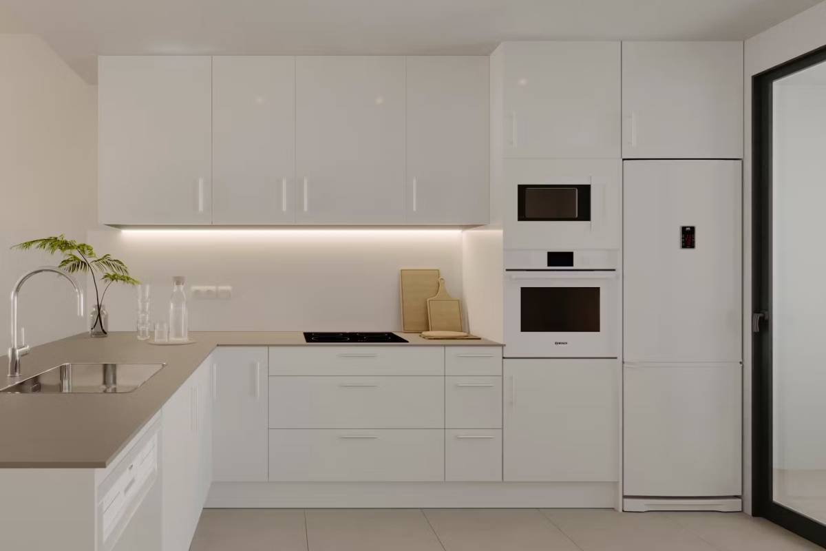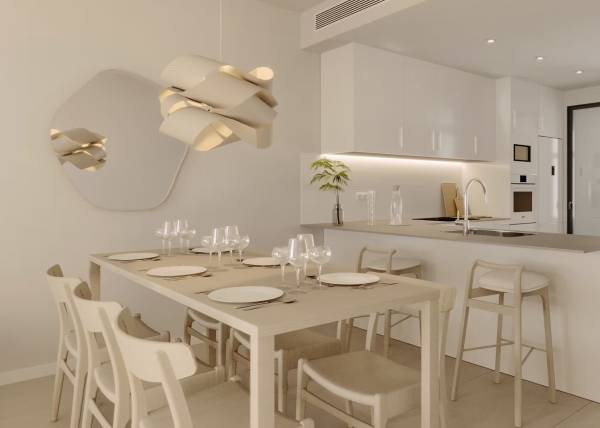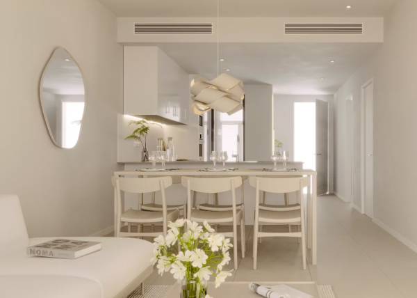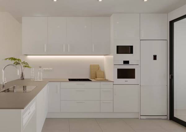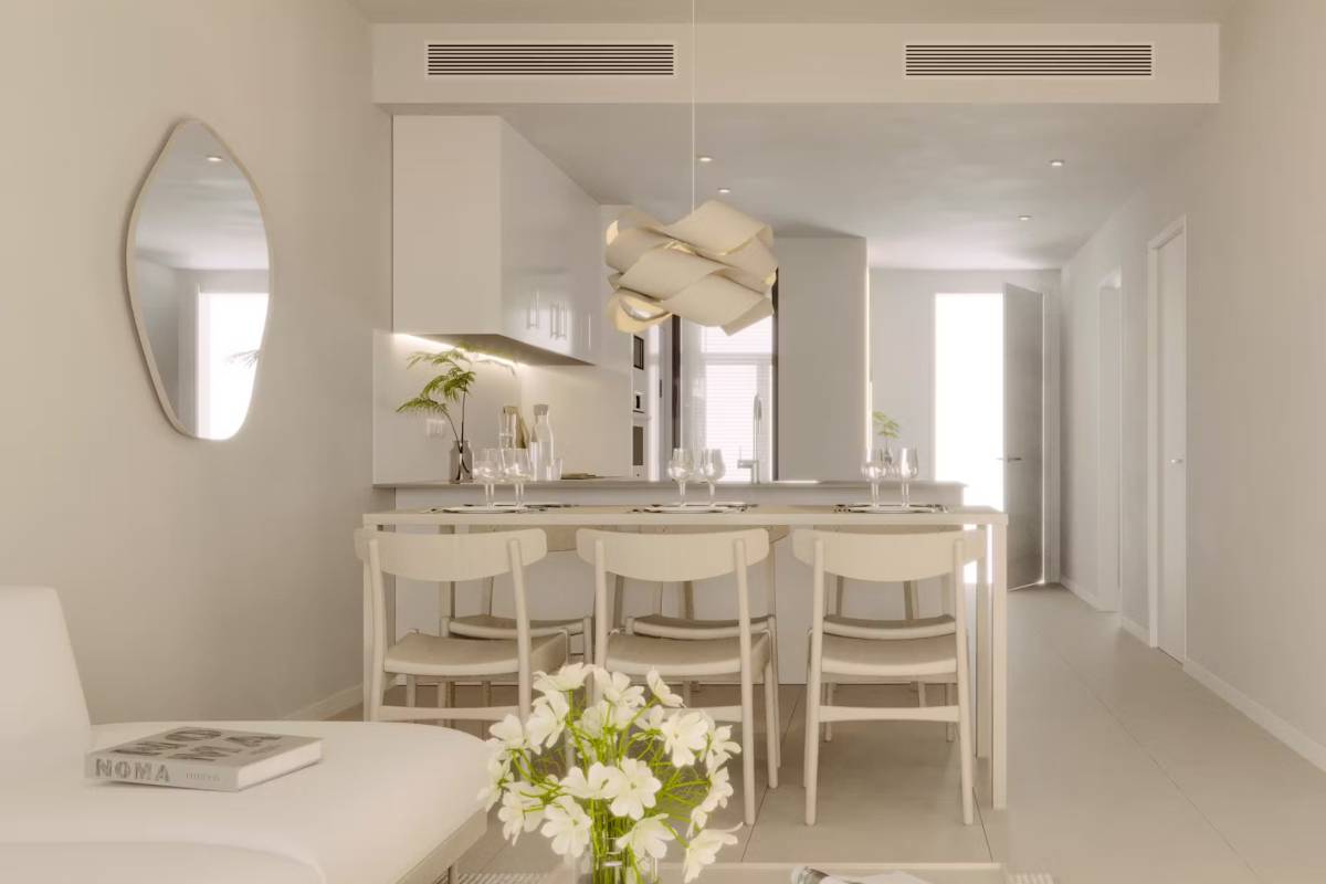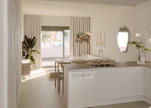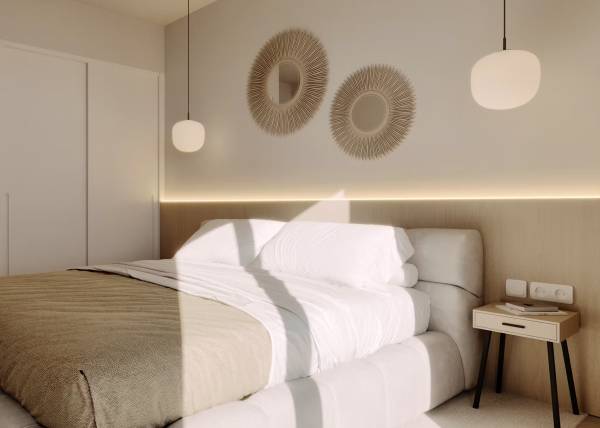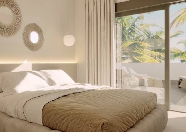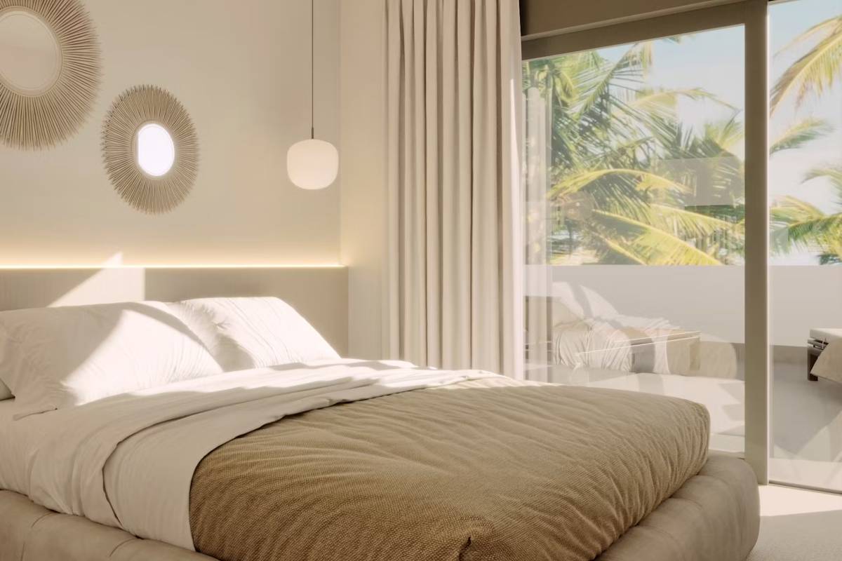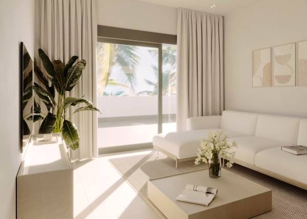 Het interieur van de woningen is ontworpen om maximaal comfort en functionaliteit te bieden. De vloeren van porseleinen tegels geven een vleugje elegantie en zijn gemakkelijk te onderhouden. Alle eigendommen zijn uitgerust met airconditioning, wat het hele jaar door een aangename sfeer garandeert. Moderne apparaten maken het dagelijks leven gemakkelijker, terwijl ingebouwde kasten efficiënte en georganiseerde opslag bieden. De indeling van de woningen is ontworpen om de ruimte te optimaliseren, met ruime woonruimtes die naadloos integreren met de terrassen, waardoor er een continue stroom ontstaat tussen binnen en buiten.