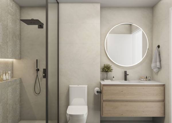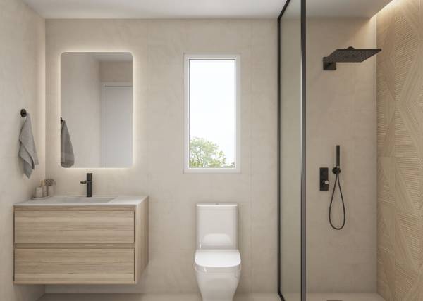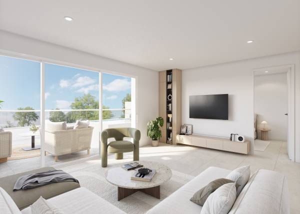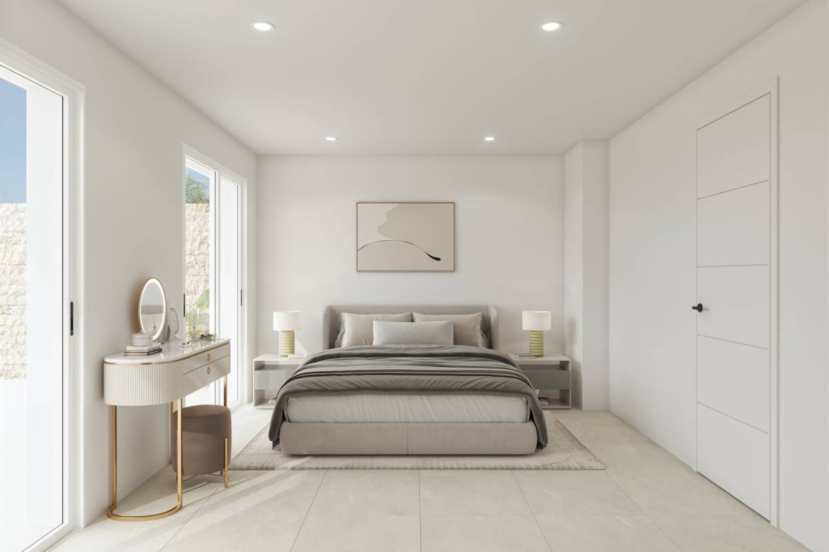 Het interieur van deze woningen is zorgvuldig ontworpen om comfort en functionaliteit te bieden. De porseleinen tegelvloeren geven een moderne uitstraling en zijn gemakkelijk te onderhouden. De woningen zijn uitgerust met elektrische rolluiken, wat een extra niveau van comfort en energie-efficiëntie toevoegt. De keuken is voorzien van inbouwapparatuur, wat het dagelijks leven vanaf dag één vergemakkelijkt. Ingebouwde kasten in de slaapkamers bieden voldoende opbergruimte, waardoor orde en organisatie behouden blijven. Bovendien zijn de woningen voorzien van een pre-installatie voor airconditioning, zodat bewoners het binnenklimaat naar wens kunnen aanpassen. De indeling omvat opties van 2 of 3 slaapkamers en 2 badkamers, passend bij verschillende gezinsbehoeften.