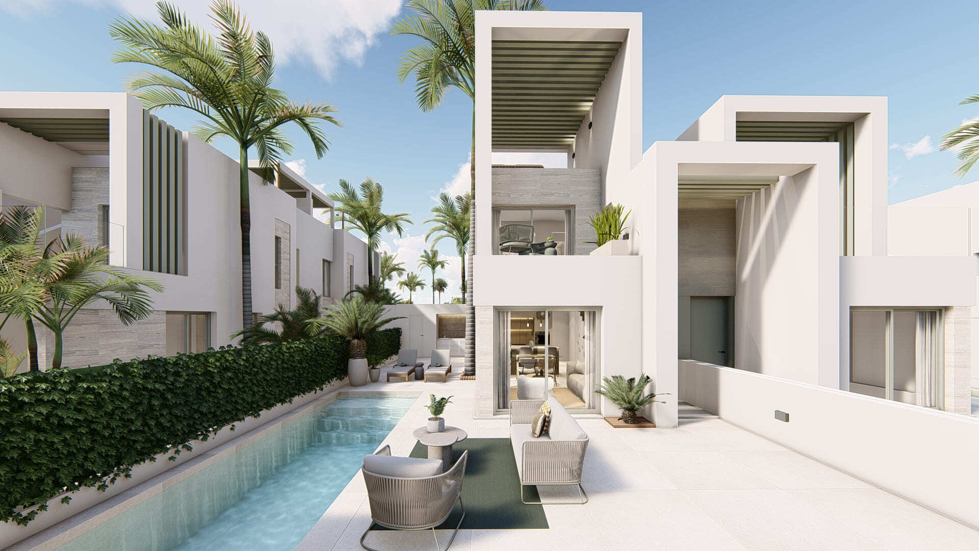 De geschakelde woningen in Ciudad Quesada vallen op door hun zorgvuldig ontworpen buitenruimtes. Elke woning heeft een privéterras, ideaal om te genieten van het mediterrane klimaat en om buitenbijeenkomsten te organiseren. Daarnaast hebben de bewoners de mogelijkheid om te genieten van een solarium, een perfecte ruimte om te ontspannen en te zonnebaden in de privacy van hun eigen huis. De toevoeging van een privézwembad in elke woning voegt een vleugje luxe en exclusiviteit toe, waardoor de eigenaren op elk moment van de dag kunnen genieten van een verfrissende duik. Deze buitenruimtes verhogen niet alleen de visuele aantrekkingskracht van de woningen, maar verbeteren ook de levenskwaliteit van de bewoners door meerdere opties voor recreatie en ontspanning te bieden.