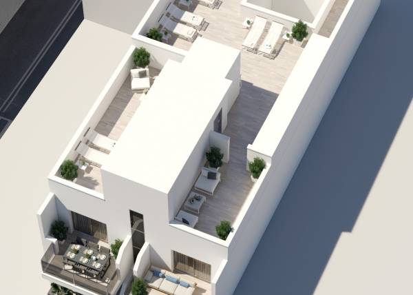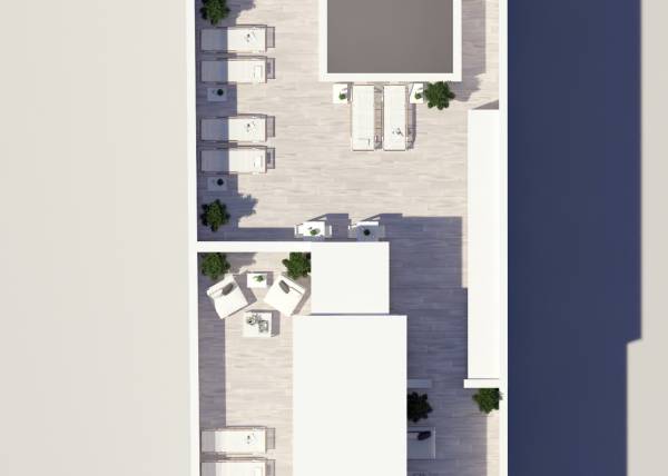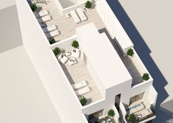 De buitenruimtes van deze woningen zijn ontworpen om de natuurlijke omgeving van Torrevieja aan te vullen. Elke woning heeft een terras, ideaal om te genieten van het uitzicht op zee en het mediterrane klimaat. De begane grond biedt directe toegang tot buitenruimtes, terwijl de penthouses beschikken over een privé solarium, dat extra ruimte biedt voor ontspanning en buitenentertainment. De nabijheid van de zee, op slechts 150 meter afstand, maakt het mogelijk om op elk moment van kustwandelingen en watersportactiviteiten te genieten. Bovendien beschikt de gemeenschap over een gemeenschappelijk solarium, perfect om te socialiseren en te genieten van de zon in een rustige en veilige omgeving.