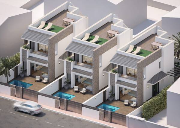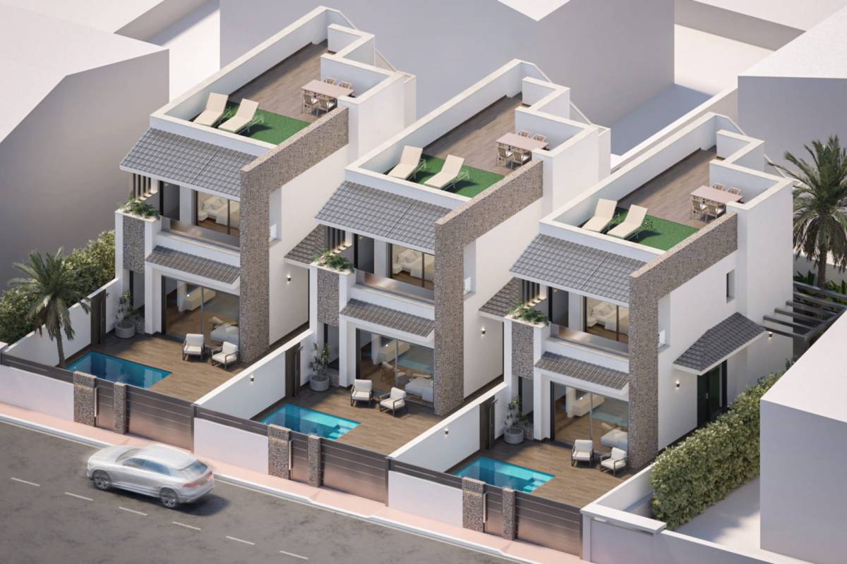 Gelegen in de charmante plaats San Pedro del Pinatar, bieden deze rijtjeshuizen een unieke kans om te genieten van het leven aan de kust. Met een modern en functioneel ontwerp is elke woning ontworpen om het comfort en gemak van de bewoners te maximaliseren. De nabijheid van de zee, op slechts 3 km, maakt het mogelijk om te genieten van de zeebries en aangename strandwandelingen. Bovendien ligt de luchthaven op slechts 8 km afstand, wat de toegang en mobiliteit vergemakkelijkt. Deze set van drie rijtjeshuizen valt op door zijn strategische locatie, ideaal voor degenen die een rustige omgeving zoeken zonder stedelijke gemakken op te geven.