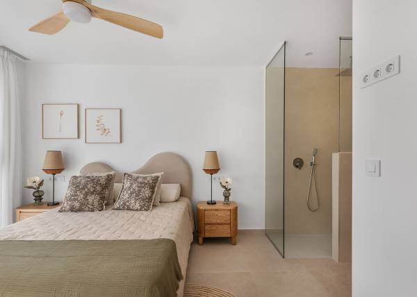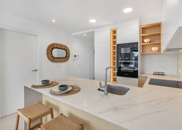 Binnen zijn de woningen uitgerust met moderne kenmerken die comfort en stijl garanderen. De appartementen en penthouses bieden opties met 2 of 3 slaapkamers en 2 of 3 badkamers, aangepast aan verschillende gezinsbehoeften. De porseleinen tegelvloeren geven een vleugje elegantie en zijn gemakkelijk te onderhouden. De keukens zijn uitgerust met apparaten die het dagelijks leven vergemakkelijken. Ingebouwde kasten bieden efficiënte opslag, terwijl de voorinstallatie van airconditioning het hele jaar door een aangename omgeving garandeert. Bovendien is er de mogelijkheid om een garage aan te schaffen, wat comfort en veiligheid toevoegt.