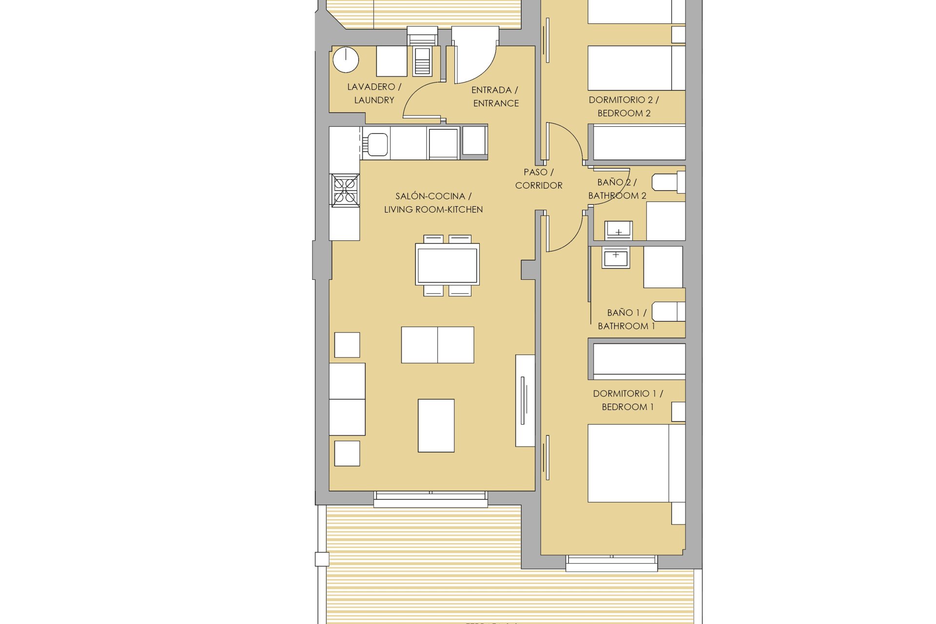 De buitenruimtes van deze woningen zijn ontworpen om optimaal te genieten van het mediterrane klimaat. Elke woning heeft een terras, ideaal om buiten te ontspannen of te genieten van maaltijden in de open lucht. Bovendien bevatten sommige typologieën een solarium, wat een extra ruimte biedt om te zonnebaden of een privé ontspanningsruimte te creëren. De tuinen, aanwezig in bepaalde configuraties, bieden een vleugje natuur en een perfecte ruimte voor buitenactiviteiten. De toevoeging van pergola's aan de buitenruimtes voegt een element van schaduw en stijl toe, waardoor het mogelijk is om zelfs op de zonnigste dagen van buiten te genieten.