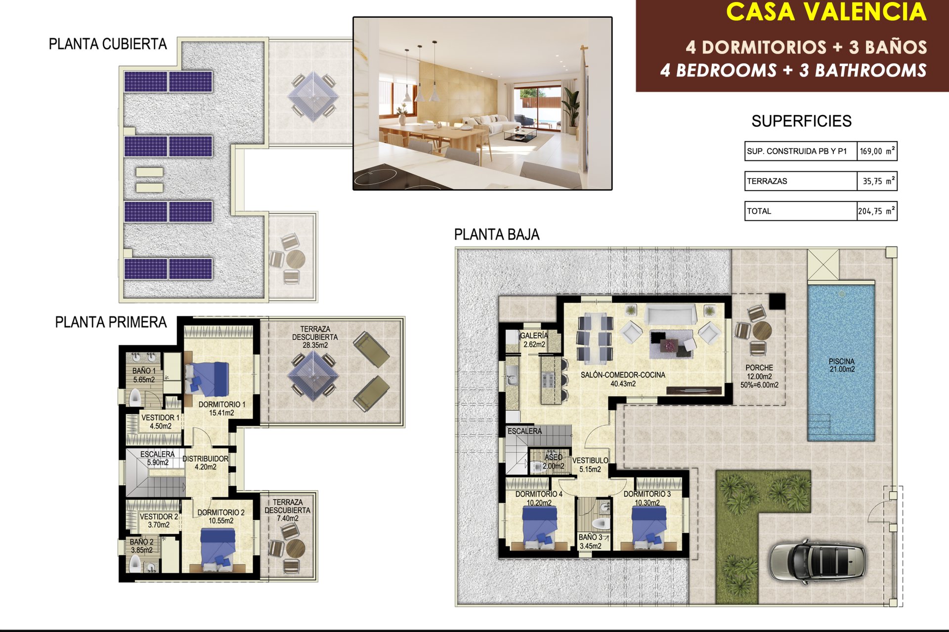 Binnen zijn de villa's uitgerust met porseleinen vloertegels, die duurzaamheid en een elegante afwerking bieden. De woningen beschikken over drie slaapkamers en drie badkamers, wat veel ruimte en comfort biedt voor het hele gezin. Elektrische rolluiken en de inbegrepen apparaten voegen een vleugje moderniteit en gemak toe. Bovendien zorgen inbouwkasten en de pre-installatie van airconditioning het hele jaar door voor optimaal comfort.