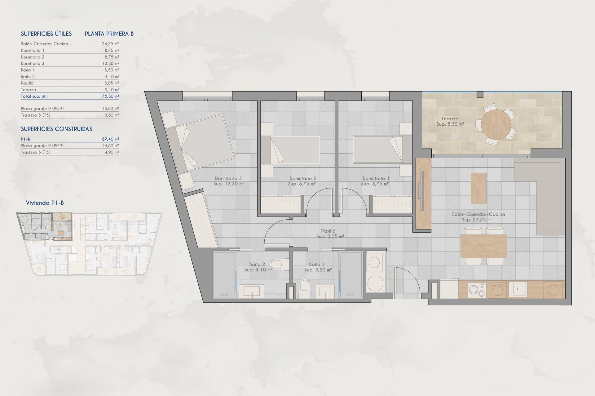 Het interieur van deze woningen valt op door zijn moderne en functionele ontwerp. De appartementen, begane grond en penthouses bieden opties met 1, 2 of 3 slaapkamers, aangepast aan verschillende gezinsbehoeften. De badkamers, beschikbaar in configuraties van 1 of 2, zijn uitgerust met hoogwaardige afwerkingen. De keuken bevat moderne apparaten die het dagelijks leven vergemakkelijken. De vloer van porseleinen tegels voegt een vleugje elegantie en duurzaamheid toe, terwijl de airconditioning het hele jaar door thermisch comfort garandeert. Ingebouwde kasten bieden efficiënte opbergoplossingen en de video-intercom voegt extra veiligheid en gemak toe.