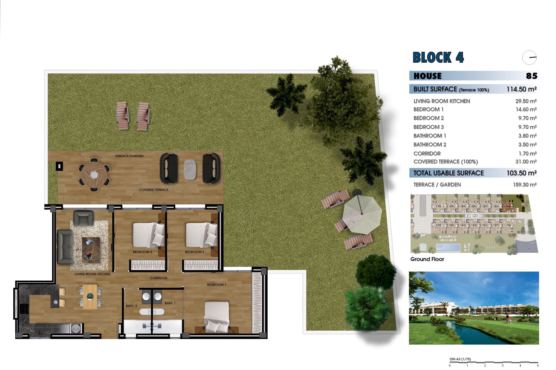 De buitenruimtes van deze woningen zijn ontworpen om een ongeëvenaarde buitenlevensstijl te bieden. Elke woning heeft een terras, ideaal om te genieten van het uitzicht en het mediterrane klimaat. Bovendien bevatten sommige typen een privé solarium, perfect om te ontspannen in de zon. De woningen op de begane grond hebben privé tuinen, die een persoonlijke groene ruimte bieden om van te genieten met familie of vrienden. Voor degenen die op zoek zijn naar een extra vleugje luxe, hebben sommige woningen een privé zwembad, dat een persoonlijke oase biedt om af te koelen tijdens de warme zomerdagen.
